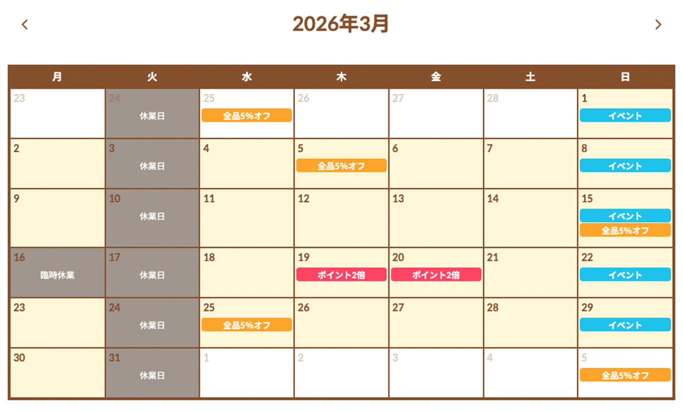 解説どおりに設定すると、表示例(小売店を想定)のようなカレンダーが設置できます。