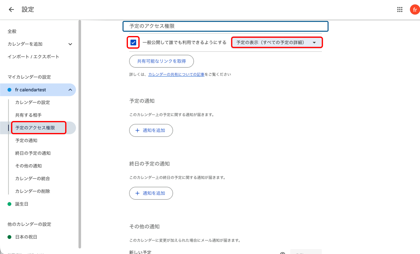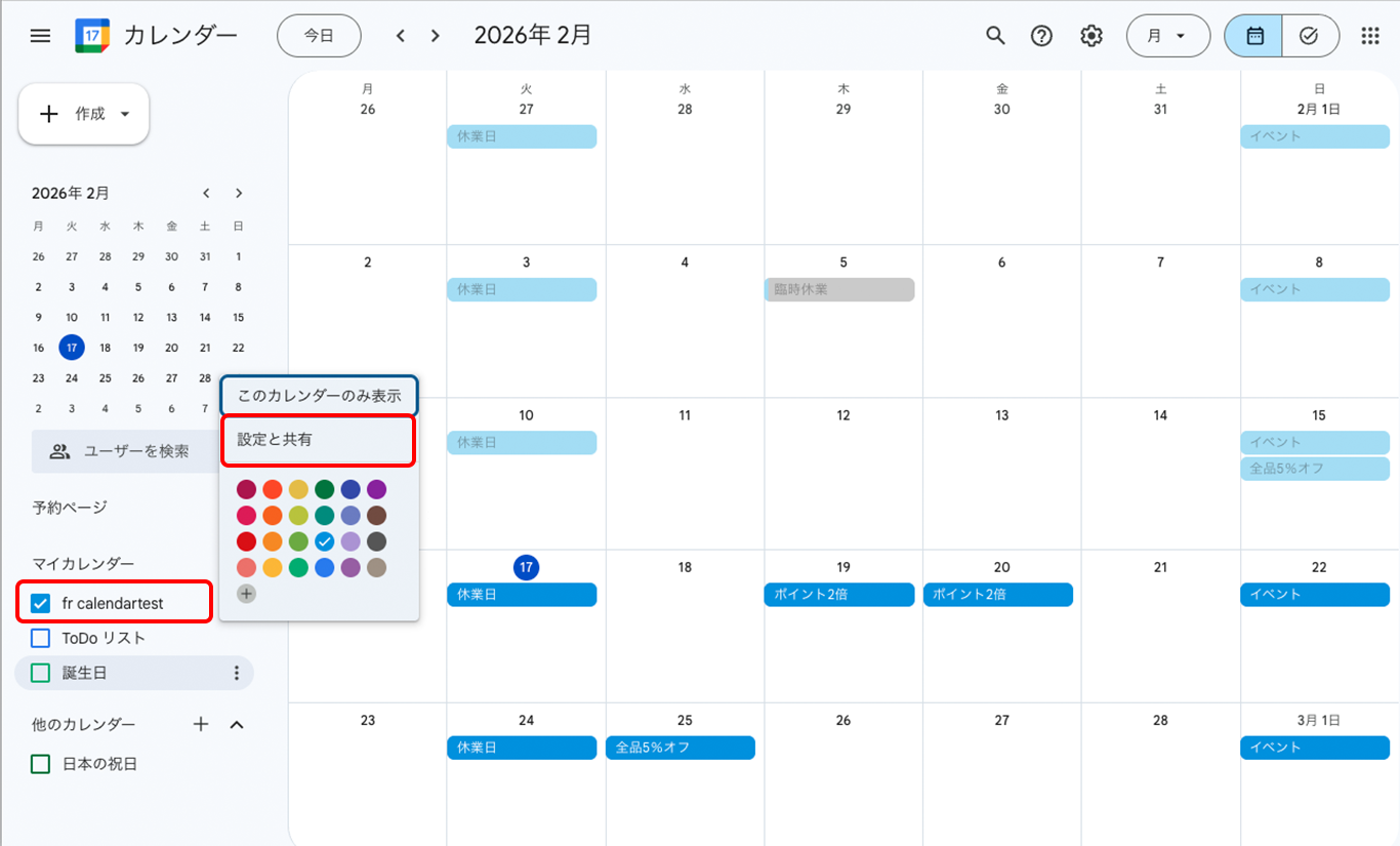 左メニューから設置したいカレンダー名の設定ボタンをクリック、
