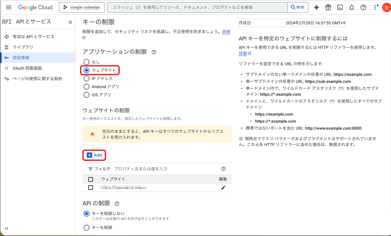 アプリケーションの制限のウェブサイトボタンにチェックします。