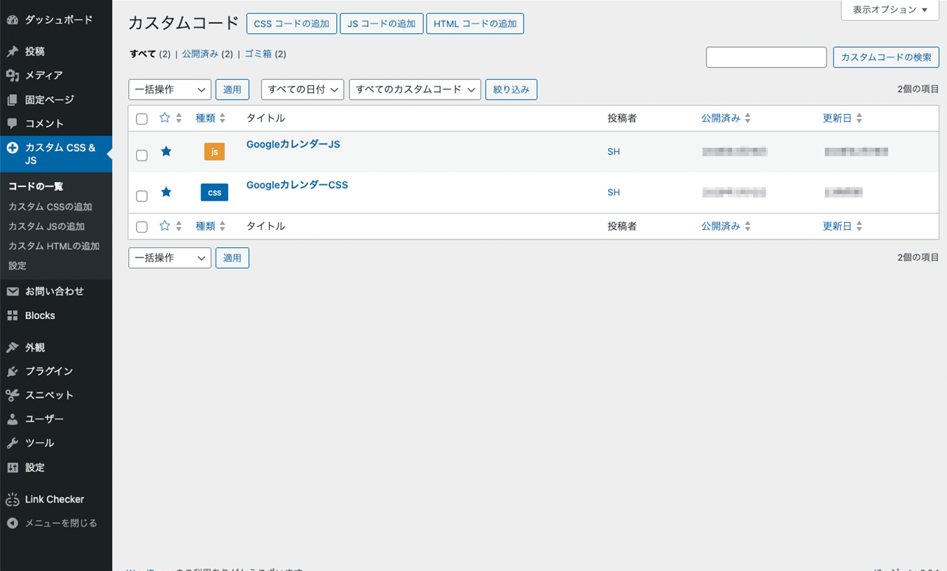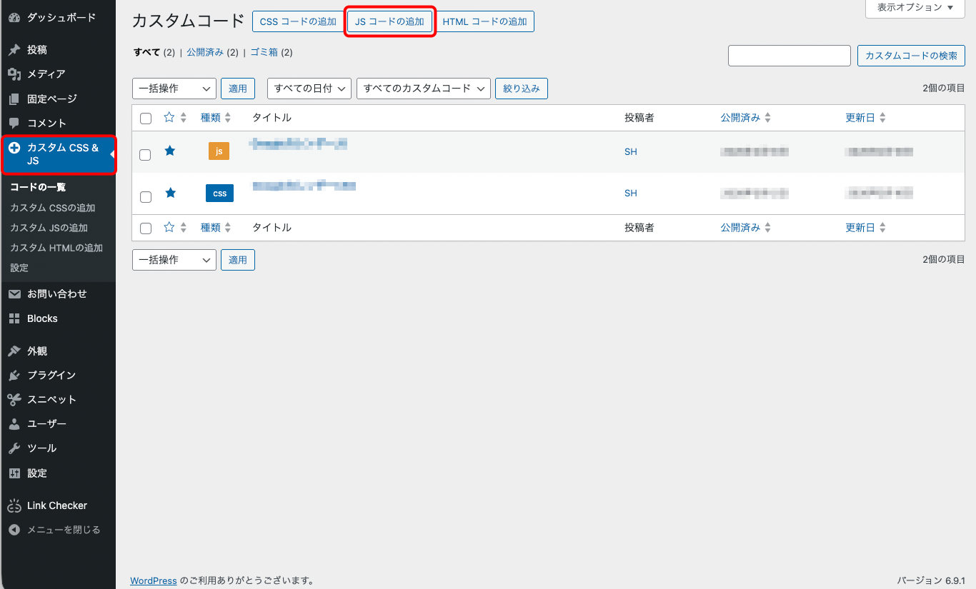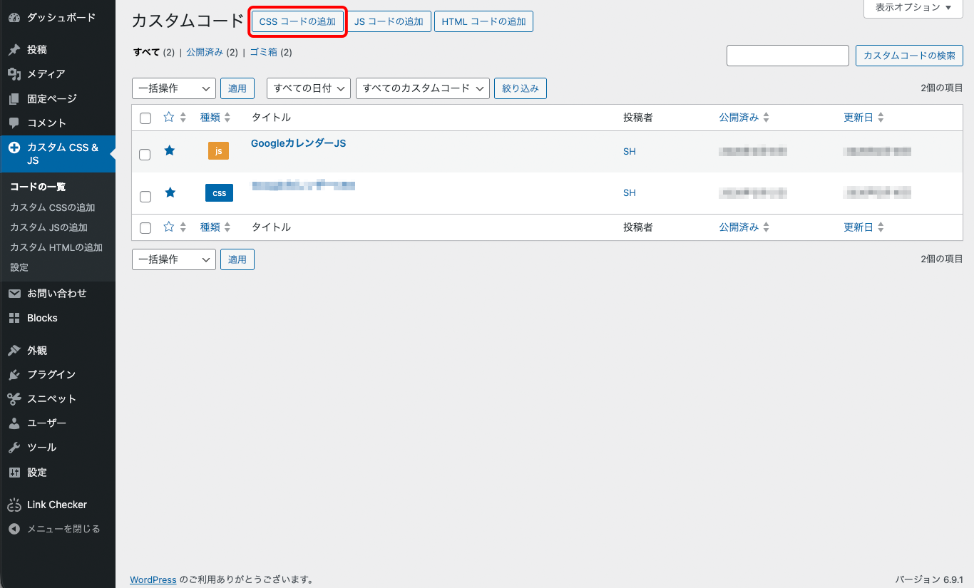 ダッシュボードの左メニューにカスタムCSS&JSが表示されるのでクリックします。
