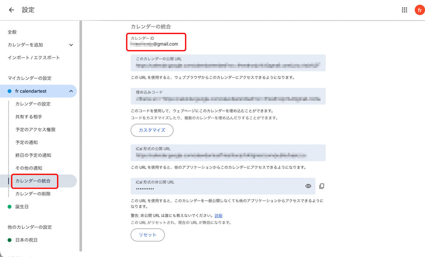 カレンダーの統合→ カレンダーID をコピーしてください。